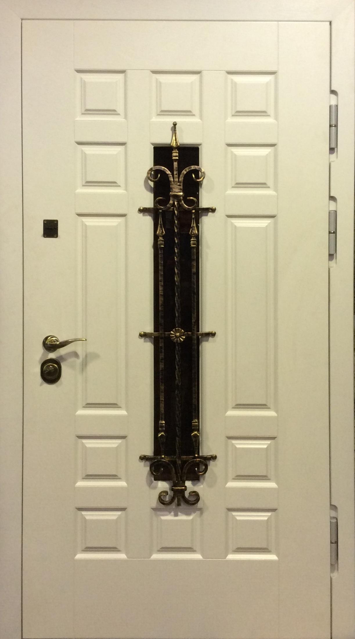 Входная металлическая дверь с порошковым покрытием стеклом и ковкой в частный дом №27